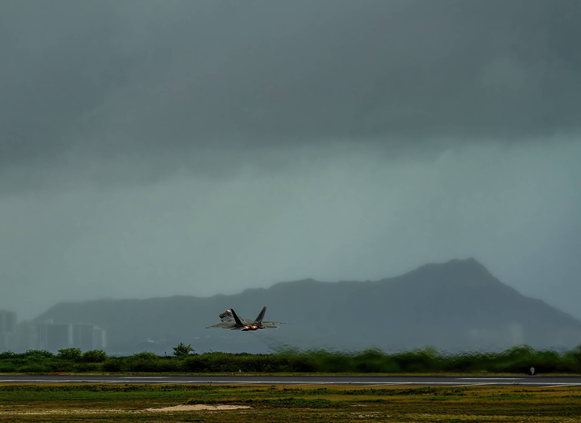 An F22 Raptor departs Honolulu towards a rainy Diamond Head.